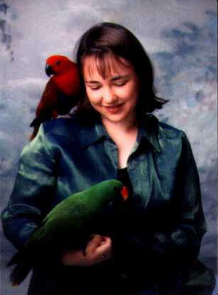 The two sexes of this species, unlike those of any other parrot, differ dramatically in color. The females, depending on the variety, are a spectacular combination of red, purple, maroon, blue and yellow; the males are almost entirely green, with red under the wings and on the side of the body, with a touch of turquoise on top of the "shoulders". Both the males and females can learn to talk clearly and distinctly, and develop a very animated personality and charm of their very own. If taught to speak, they will not develop the annoying tendency to screech which is exhibited by other types of large birds. Instead, they will entertain you spontaneously with a hysterical monologue of every phrase they know, complete with inflections and melodious tones that they come up with all by themselves.