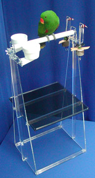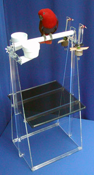 Mix or match colors - Clear or Amber Acrylic Side Panels • Tough transparent acrylic either clear or amber Carry these 36" high floor stands from room to room with only one hand! Enjoy the transparent beauty and durability of thick acrylic, which is ideal for large birds like Cockatoos and Macaws. The BEST feature is a lift-off tray for easy cleaning which rests on the center braces. Sanitizing is a breeze, or stretch Saran Plastic Wrap over the tray for a quick clean-up. Two plastic Lixit cups are included, as well as a double toy that matches the sides color you select. Your bird will stand in comfort on a sure-grip, indestructible pedicure perch that automatically trims nails. The pedicure perch is 16"or 24" wide, with a diameter of 1", 1.5" or 2". We help you select the correct size perch and cups for your type of bird. Choose amber or clear sides and an amber, red, blue or green tray. All sets are available with or without cups or toys. Please phone for quote including the correct components for your size and type of bird, to go over the custom accessories that can be chosen to perfectly suit your pet -- or to place an order |