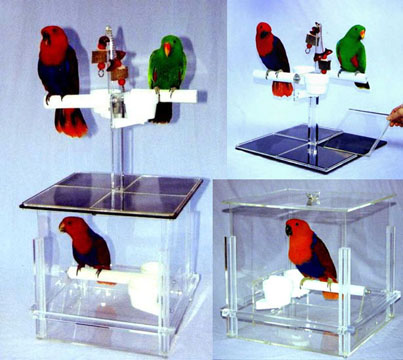 This set is so well designed that the Pedicure Pedestal can be placed on TOP of the Kitchen Kube in place of the lid, and only a 16" x 16" area on the counter top is covered by the set! Even the smallest kitchen will be maintained clean and tidy. When your birdy finishes eating his messy food in the Kube, put him up top on the Pedestal. Two cups are for fresh water and non-messy treats, and the Pedestal is perfect for 1 or 2 birds. Both birds can reach both cups and share the double toy. Air circulation is excellent in the Kube. The top 5" on each corner has a 1/2" x 5" slot, which totals 10" square of open area for more air circulation than any acrylic carrier with drilled holes. However, birdy and the food he flings cannot escape. The kitchen stays CLEAN. The set is so well designed, the Pedestal can even stay on top while the cube is being rinsed. Each side panel can slide up separately to be rinsed and slid back in place to dry. A slide-out base panel catches all the mess on the bottom, and the perch also lifts out for easy cleaning and refilling. |